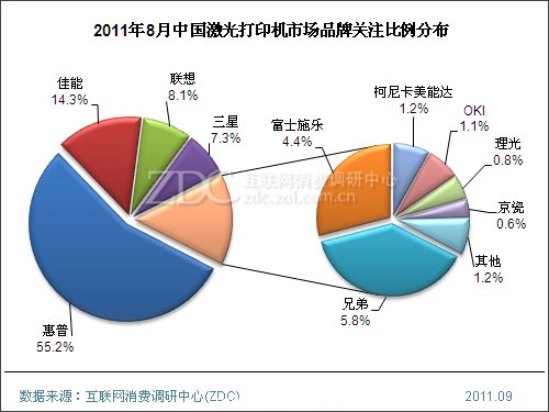(圖) 2011年8月中國(guó)激光打印機(jī)市場(chǎng)品牌關(guān)注比例分布