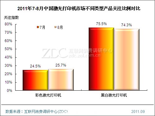 黑白激光打印機(jī)無(wú)論是購(gòu)置成本還是使用成本均較低,因此成為了商用辦公設(shè)備中必不可少的一員。2011年8月,中國(guó)激光打印機(jī)市場(chǎng)中,黑白激光打印機(jī)以74.3%的關(guān)注份額領(lǐng)先與彩色產(chǎn)品,其主角地位不可動(dòng)搖。