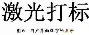 在進(jìn)行圖形打標(biāo)時(shí),導(dǎo)入圖形文件并作圖像處理后,轉(zhuǎn)化成打標(biāo)位置數(shù)據(jù);文字打標(biāo)時(shí)在VisualBasic中調(diào)用Windows API函數(shù)GetGly-phOutline得到文字的外形輪廓,可以進(jìn)行放縮、旋轉(zhuǎn)等操作而不影響文字顯示質(zhì)量,并通過DrawGlyph函數(shù)將其顯示效果在用戶界面上顯示。圖6是軟件用戶界面漢字的顯示效果。