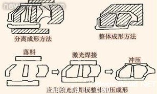 激光拼焊板技術(shù)是基于成熟的激光焊接技術(shù)發(fā)展起來的現(xiàn)代加工工藝技術(shù),是通過高能量的激光將幾塊不同材質(zhì)、不同厚度、不同涂層的鋼材焊接成一塊整體板再?zèng)_壓生產(chǎn),以滿足零部件不同部位對(duì)材料不同性能的要求。拼焊板工藝的出現(xiàn)解決了由傳統(tǒng)單一厚度材料所不能滿足的超寬板及零件不同部位具有不同工藝性能要求的工藝問題。圖1為分別成形、整體成形和激光拼焊成形生產(chǎn)轎車側(cè)圍外板的示意圖。