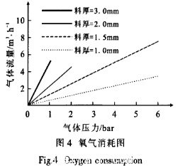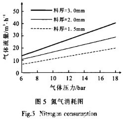 由圖5可以看出。對(duì)于δ0.5mm~6mm的同一種料厚的板料,單位時(shí)間內(nèi)從噴嘴噴出氮?dú)鈿怏w體積隨著使用壓力的提高而提高,對(duì)于不同料厚的板料.在同一壓力下單位時(shí)間內(nèi)從噴嘴噴出氣體體積增量與料厚增量的平方成正比。由于氮?dú)鈮毫υ?bar以上才對(duì)切割起到有效作用。所以氣體消耗量大。