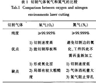 切割氣體氧氣和氮?dú)獾谋容^見表1。
