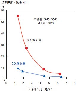 光纖激光器切割在切割薄型金屬的時(shí)候,相比CO2激光器有明顯的速度優(yōu)勢(shì),如圖1所示。從圖2和圖3中可以看出,在所標(biāo)明的切割速度下,光纖激光器切割比CO2激光器所需要的功率要低,說明工件材料所吸收的光纖激光器光束更多,從而提高光纖激光器光束的融化速度。表1中呈現(xiàn)的是圖2和圖3光纖激光系統(tǒng)應(yīng)用中的規(guī)格。光纖激光器的速度優(yōu)勢(shì)在切割厚型金屬的時(shí)候并不明顯。對(duì)于較大的工件厚度(大于4毫米),光纖激光器切割速度下降到一個(gè)相當(dāng)于CO2激光器切割速度的水平。從本質(zhì)上講,光纖激光器切割大型厚工件的速度大幅下降,主要?dú)w因于光纖激光器輻射的吸收機(jī)制。金屬部件對(duì)光纖激光器輻射的吸收性在其厚度較小的時(shí)候達(dá)到最高值,隨之變厚時(shí)而下降;相反CO2激光器的輻射吸收性隨著加工金屬部件的厚度增加而增強(qiáng),在加工部件厚度達(dá)到最高的時(shí)候吸收性也隨之達(dá)到最高值。