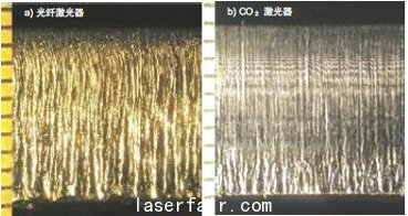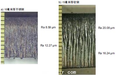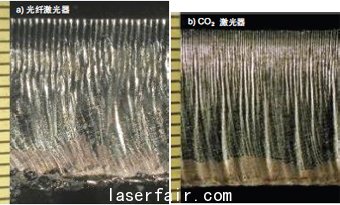 圖4顯示了使用類似加工參數(shù)的光纖激光器和CO2激光器在加工10毫米厚的不銹鋼中獲得的典型切割邊緣質量。與光纖激光器相比,CO2激光器可獲得更卓越的切割邊緣質量。利用高光度的光纖激光器在高速切割厚型鋼材時產生的狹窄切縫實現(xiàn)有效的熔融噴射是有難度的,結果造成切割邊緣質量的下降。