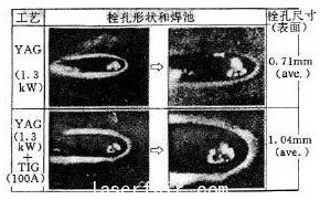 焊接坡口縫隙余量的同軸TIG-YAG激光焊接的結(jié)果。僅用YAG時(shí)焊接坡口縫隙為0.4mm時(shí),會(huì)產(chǎn)生咬邊。而同軸TIG-YAG激光焊接時(shí)焊接坡口縫隙可達(dá)0.8mm。圖18示出根據(jù)焊接焊道的斷面研究氣孔發(fā)生狀況的結(jié)果。因?yàn)楸Wo(hù)氣體中使用了Ar,所以僅采用YAG時(shí)不可避免在部分焊道中產(chǎn)生氣孔。而同軸TIG-YAG激光焊接可以控制氣孔的發(fā)生,如圖19所示,這是因?yàn)橥STIG-YAG激光焊接比單用YAG時(shí)栓孔上部的孔徑大,金屬蒸汽容易排出。