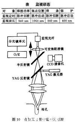 相對于各種監(jiān)視對象,激光器輸出和內(nèi)部波狀態(tài),監(jiān)視波長取940nm,探測了脈沖斷開時(shí)熔化池的發(fā)光。從這個(gè)波長所使用的傳感器(硅光二極管)的光譜響應(yīng)特性和監(jiān)視對象的溫度變化范圍,根據(jù)普朗克輻射定律進(jìn)行波長選定解析,實(shí)際上又對各種波長進(jìn)行了監(jiān)視,最后選出靈敏度最好的監(jiān)視波長。關(guān)于焦點(diǎn)位置變化,抽出脈沖接通時(shí)YAG激光器的反射光,關(guān)于保護(hù)狀況的穩(wěn)定性,為了探測更高溫度時(shí)激光光圈的發(fā)光,把脈沖接通時(shí)400nrn的短波長光抽出。 #p#分頁標(biāo)題#e#