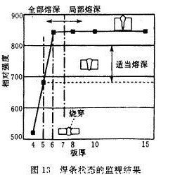 圖11示出焊接輸出的監(jiān)視結(jié)果與熔深深度的比較。從此結(jié)果中可以看出,熔深深度變化0.4mm時(shí),就可探測到輸出功率100W左右的焊接變化。圖12示出焦點(diǎn)位置和YAG激光器反射光及熔深深度的關(guān)系。這里雖然采用焦點(diǎn)深度Bf=200mm的大透鏡,但是可以探測士4mm的熔深變化。圖13示出穿透和未穿透時(shí)的發(fā)光強(qiáng)度變化。穿透焊接時(shí),因?yàn)槿廴诮饘僭诎鍍?nèi)穿過,所以發(fā)光強(qiáng)度下降,于是就能探測到可以獲得穩(wěn)定的內(nèi)部波焊道的狀態(tài)。