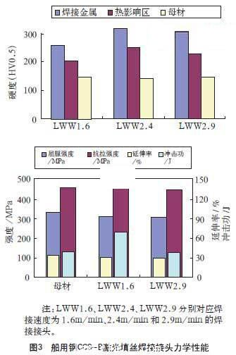 利用最大輸出功率達(dá)15kW的高功率CO2激光,先采用激光填絲焊接(LWW)技術(shù)實(shí)現(xiàn)了8mm SUS304不銹鋼、8mmCCS-B鋼、10mm CCS-A36鋼和12mm 10CrNiMnMo鋼的對(duì)接焊以及8mm不銹鋼板的單邊熔透角焊。使用的激光功率基本都在8kW以上。接頭性能測(cè)試(圖3)表明,結(jié)構(gòu)鋼和低合金高強(qiáng)鋼的接頭焊縫區(qū)因馬氏體的出現(xiàn)使其硬度最大,一般為HV300以上,低合金高強(qiáng)鋼甚至可達(dá)HV360以上。可見(jiàn)焊縫強(qiáng)度必然明顯高于母材。接頭的拉伸性能顯示焊接接頭與母材是等強(qiáng)的,試樣的拉伸斷裂均發(fā)生在母材側(cè)。對(duì)8mmCCS-B鋼激光填絲焊焊縫進(jìn)行的室溫Charpy缺口沖擊試驗(yàn)表明,焊縫沖擊性能不低于母材。在通過(guò)工藝優(yōu)化,適當(dāng)降低焊接速度和激光功率,使焊縫金相組織得到優(yōu)化,馬氏體成分減少,焊縫硬度值降低,沖擊韌性有所提高。