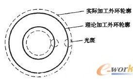 在其它參數(shù)一定的情況下,激光光斑大小對尺寸精度會產(chǎn)生較大的影響,假定其激光能量足夠熔化金屬粉末,不產(chǎn)生球化現(xiàn)象,激光光斑越大,則尺寸誤差越大,反之則誤差減小。分析原因:因為快速成型系統(tǒng)中采用的加工路徑是線掃描路徑,即把加工面看成是線的集合,如果光斑是一個點,則加工實際輪廓和理論輪廓重合,但由于激光光斑具有一定的大小,因此,如果加工如圖1所示的零件,則它的外環(huán)輪廓和內(nèi)環(huán)輪廓會比理論輪廓大或者小一個光斑半徑,實際加工輪廓如圖1中虛線所示。