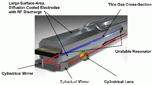 工作物質(zhì)CO2位于兩個(gè)矩形電極之間并由射頻激勵(lì)。激光功率由電極間距決定。激光工作氣體由電極擴(kuò)散冷卻,