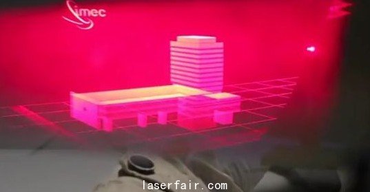 在微電子研究中心研制的微系統(tǒng)中,二氧化硅呈一塊塊正方形的補(bǔ)丁鑲嵌于芯片上,形成了一種西洋跳棋盤式的圖案。然后,芯片上層再鍍上一層反射性鋁膜。當(dāng)激光照射到芯片上時(shí),芯片會(huì)將臨近象素的反射光呈某種角度反射出去。衍射的光線呈建設(shè)性或破壞性地相互干涉,從而形成了一幅3-D圖像。此時(shí),這些小型的反射平臺(tái)每秒鐘數(shù)次上下左右快速移動(dòng),從而形成一個(gè)移動(dòng)的投影。