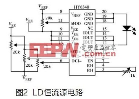 LD供電電路是一個恒流源(見圖2)。ETC公司恒流源驅(qū)動芯片HY6340為核心元件。供電電壓VEE的穩(wěn)定對輸出恒流信號的穩(wěn)定起著重要作用,因此采用多重濾波技術(shù),將VEE的紋波控制在lmV以下,保證HY6340芯片輸出端12、13、14引腳信號的穩(wěn)定。調(diào)節(jié)5引腳和6引腳到VEE之間的電壓可以分別設(shè)定過流保護(hù)閥值和過溫保護(hù)值。在恒定電流工作方式下,通過調(diào)節(jié)21引腳的輸出電平來控制輸出電流的大小在0~1.5A之間連續(xù)可調(diào)。