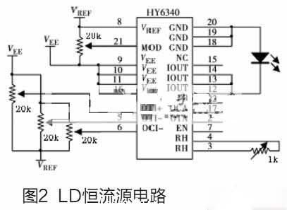 LD供電電路是一個恒流源(見圖2)。ETC公司恒流源驅(qū)動芯片HY*0為核心元件。供電電壓VEE的穩(wěn)定對輸出恒流信號的穩(wěn)定起著重要作用,因此采用多重濾波技術(shù),將VEE的紋波控制在lmV以下,保證HY*0芯片輸出端12、13、14引腳信號的穩(wěn)定。調(diào)節(jié)5引腳和6引腳到VEE之間的電壓可以分別設(shè)定過流保護(hù)閥值和過溫保護(hù)值。在恒定電流工作方式下,通過調(diào)節(jié)21引腳的輸出電平來控制輸出電流的大小在0~1.5A之間連續(xù)可調(diào)。