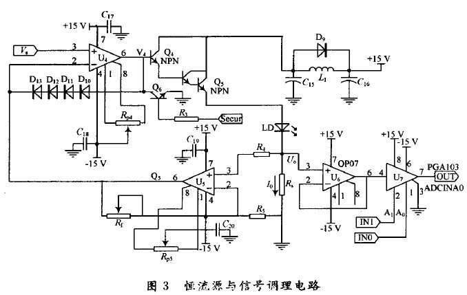 運放U4,U5,電阻Rs,R5,Rf自身的穩(wěn)定性恒流源的穩(wěn)定性起決定性作用。因此,U4,U5選用高精度運放OP-27,其漂移僅為0.2μV/℃,其最大噪聲電壓為0.25μV。R5,Rf選用溫漂系數(shù)低、精度較高的電阻。采樣電阻Rs選用阻值為0.01Ω大功率錳銅絲電阻,其精度為1%。Q5為大功率達林頓管2SD1559,由于集成運算放大器一般工作在小電流狀態(tài),因此用一個小功率晶體管Q4(9014)驅動Q5。C15,C16,D9,L1構成低通濾波以減少電源中高次諧波對LD的影響,D5在Q5截止時起到扼制流作用。