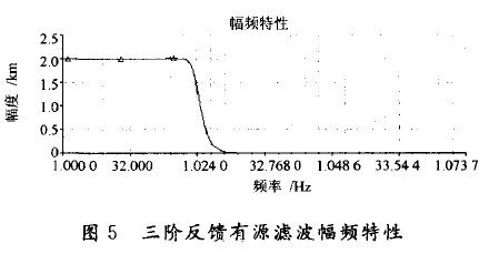 由歸一化方法可得,將截止頻率fc(Hz)和電容C21都歸一化,所以電阻系數(shù)為K=100/fcCˊ,Cˊ是以μF為單位的C21值,要使增益G=2時,由文獻[6]中表2-54可知。K=1時所對應電阻R6~R10電容C22~C23(μF)的系數(shù)分別2.491,2.339,0.692,11.043,11.043,C21,C21。選擇fc=1000,Cˊ=0.01時,圖4中R6~Rl0,C21~C23分別為24.491,23.39,6.92,110.43,110.43,0.01,0.01,0.01。
