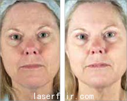 嚴(yán)重不良反應(yīng)見于其中1例受試者兩次治療后。兩次均表現(xiàn)為輕度的單純皰疹樣皮疹,與FP第2次和第3次治療有關(guān)。受試者在治療后10天皮疹恢復(fù)。組織學(xué)研究表明CO2激光治療后膠原刺激較FP儀治療組多50%。其中1例患者的治療結(jié)果見圖3。