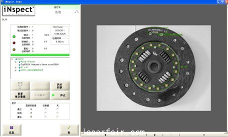 汽車離合器從動盤是手排擋有級變速汽車必不可少的易耗損零部件。每個從動盤的裝配是否合格都要經過嚴格的檢測,機器視覺在此環(huán)節(jié)中起到了無法取代的作用。如圖案例,上海波創(chuàng)電氣有限公司使用DALSA機器視覺系統檢測從動盤在裝配過程中是否有鉚釘漏裝,并用字符讀取工具讀取其批號,方便產品跟蹤備案。
