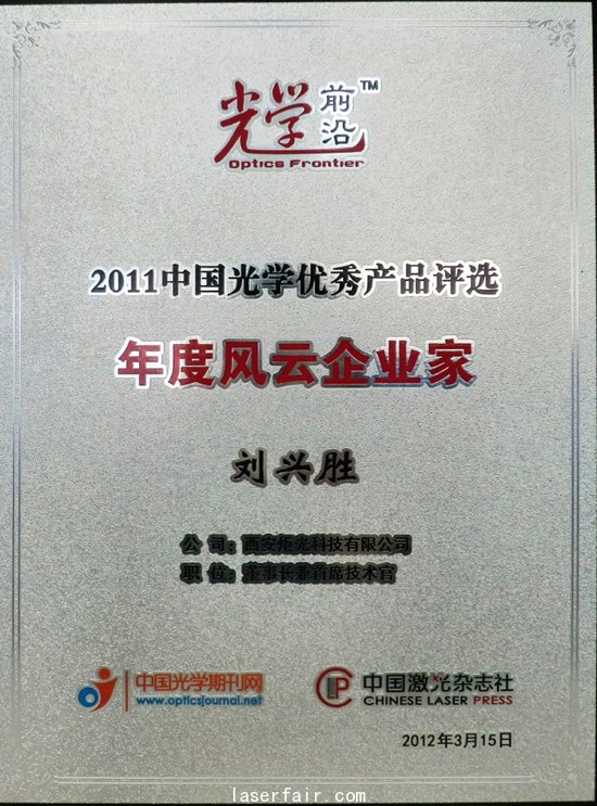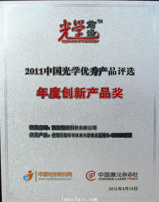 由中國激光雜志社舉辦的“2011年度中國光學(xué)優(yōu)秀產(chǎn)品”評選活動(dòng)已于2012年3月21日晚在上海圓滿落下帷幕。經(jīng)過網(wǎng)上公開投票及專家和行業(yè)媒體的綜合評定,西安炬光科技有限公司的傳導(dǎo)冷卻垂直疊陣G-STACK系列產(chǎn)品最終在此次活動(dòng)中獲得“年度創(chuàng)新產(chǎn)品獎(jiǎng)”的殊榮,同時(shí)炬光科技董事長劉興勝博士也被授予“年度風(fēng)云企業(yè)家”的稱號。