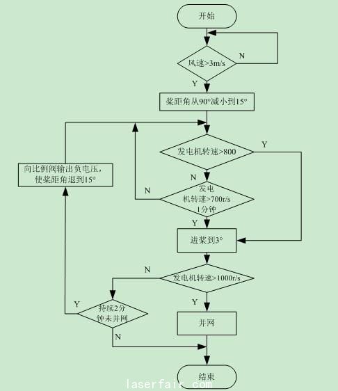 風(fēng)力機(jī)起動(dòng)時(shí)變槳控制程序流程如圖7所示。當(dāng)風(fēng)速高于起動(dòng)風(fēng)速時(shí)PLC通過模擬輸出單元輸出1.8V電壓,使葉片以0.9°/s的速度變化到15°。此時(shí),若發(fā)電機(jī)的轉(zhuǎn)速大于800r/s或者轉(zhuǎn)速持續(xù)一分鐘大于700r/s,則槳葉繼續(xù)進(jìn)槳到3°位置。PLC檢測(cè)到高速計(jì)數(shù)單元的轉(zhuǎn)速信號(hào)大于1000r/s時(shí)發(fā)出并網(wǎng)指令。若槳距角在到達(dá)3°后2分鐘未并網(wǎng)則由模擬輸出單元給比例閥輸出-4.1V電壓,使槳距角退到15°位置。