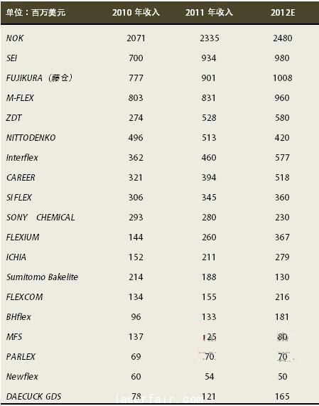 盡管日本廠家遭遇311地震、泰國洪水、日元升值三重打擊,依然取得了非常優(yōu)秀的成績,尤其NOK仍然保持全球霸主地位。除NOK外,F(xiàn)PCB對日本企業(yè)都不是核心業(yè)務(wù),F(xiàn)UJIKURA一度欲縮減FPCB業(yè)務(wù)規(guī)模,不過2011年iPad給了Fujikura更多信心。