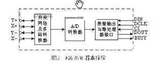 觸摸屏控制器有多種,主要的功能均是在微處理器的控制下向觸摸屏的兩個方向分時施加電壓,并將相應(yīng)的電壓信號傳送給自身A/D轉(zhuǎn)換器,在微處理器SPI口提供的同步時鐘作用下將數(shù)字信號讀入微處理器??刂破鰽DS7846基本結(jié)構(gòu)如圖2所示。