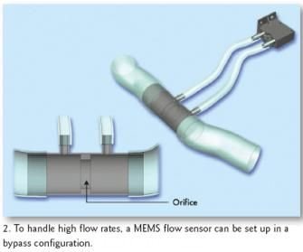 降低成本、減少空間、減輕重量的一個(gè)方法是在旁路通道設(shè)置低流量傳感器來(lái)測(cè)量主通道上較大的流量。MEMS流量傳感器旁路通道設(shè)置類似于差壓傳感器(間接測(cè)量氣體流量,見(jiàn)圖2).。與壓差傳感器相比,MEMS傳感器在很低流量情況下依然可以提供更高的分辨率。圖3描述了普通大流量傳感器與壓差傳感器之間的區(qū)別。在流量接近于零的情況下,壓差曲線變緩,難于判別該位置的流量究竟為零還是為負(fù)。