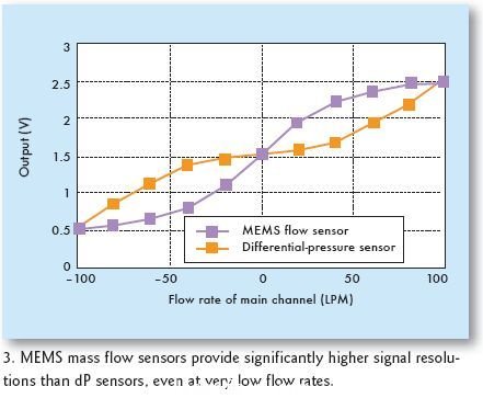 降低成本、減少空間、減輕重量的一個(gè)方法是在旁路通道設(shè)置低流量傳感器來(lái)測(cè)量主通道上較大的流量。MEMS流量傳感器旁路通道設(shè)置類似于差壓傳感器(間接測(cè)量氣體流量,見圖2).。與壓差傳感器相比,MEMS傳感器在很低流量情況下依然可以提供更高的分辨率。圖3描述了普通大流量傳感器與壓差傳感器之間的區(qū)別。在流量接近于零的情況下,壓差曲線變緩,難于判別該位置的流量究竟為零還是為負(fù)。
