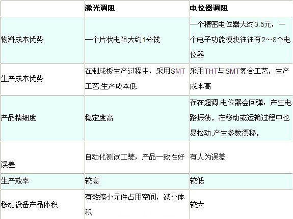 表1:激光調(diào)阻VS 精密電位器調(diào)阻