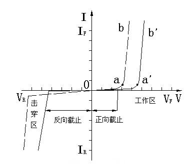 V>0時(shí),V>VF的正向工作區(qū)IF隨VF指數(shù)上升IF=ISeqVF/KT