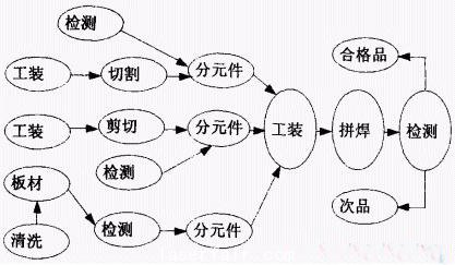激光拼焊一般由多塊焊板(分元件)經(jīng)工裝、焊接、檢測(cè)等工序得到成品(總元件);而每個(gè)分元件在進(jìn)入焊接加工前,也需要進(jìn)行工裝、切割、檢測(cè)、清洗等工序,得到以總元件加工為總結(jié)點(diǎn)以分步加工為分節(jié)點(diǎn)的有序樹(shù)形結(jié)構(gòu),如下圖2所示。#p#分頁(yè)標(biāo)題#e#
