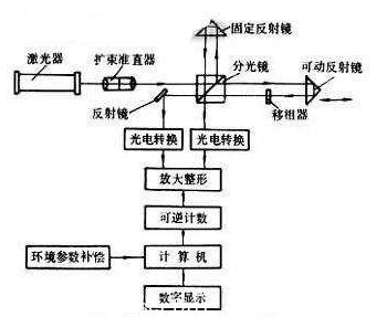 圖1為單頻激光干涉儀的工作原理。從激光器發(fā)出的光束,經(jīng)擴(kuò)束準(zhǔn)直后由分光鏡分為兩路,并分別從固定反射鏡和可動(dòng)反射鏡反射回來會(huì)合在分光鏡上而產(chǎn)生干涉條紋。當(dāng)可動(dòng)反射鏡移動(dòng)時(shí),干涉條紋的光強(qiáng)變化由接受器中的光電轉(zhuǎn)換元件和電子線路等轉(zhuǎn)換為電脈沖信號(hào),經(jīng)整形、放大后輸入可逆計(jì)數(shù)器計(jì)算出總脈沖數(shù),再由電子計(jì)算機(jī)按計(jì)算式: