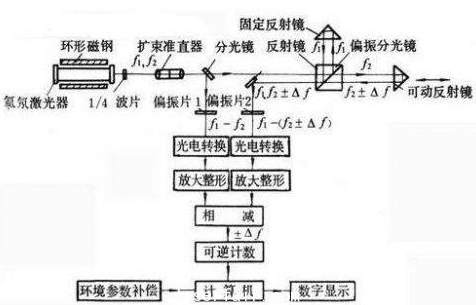 圖2為雙頻激光干涉儀的工作原理。在氦氖激光器上,加上一個(gè)約0.03特斯拉的軸向磁場。由于塞曼分裂效應(yīng)和頻率牽引效應(yīng),激光器產(chǎn)生1和2兩個(gè)不同頻率的左旋和右旋圓偏振光。經(jīng)1/4波片后成為兩個(gè)互相垂直的線偏振光,再經(jīng)分光鏡分為兩路。一路經(jīng)偏振片1后成為含有頻率為f1-f2的參考光束。另一路經(jīng)偏振分光鏡后又分為兩路:一路成為僅含有f1的光束,另一路成為僅含有f2的光束。當(dāng)可動(dòng)反射鏡移動(dòng)時(shí),含有f2的光束經(jīng)可動(dòng)反射鏡反射后成為含有f2 ±Δf的光束,Δf是可動(dòng)反射鏡移動(dòng)時(shí)因多普勒效應(yīng)產(chǎn)生的附加頻率,正負(fù)號(hào)表示移動(dòng)方向(多普勒效應(yīng)是奧地利人C.J.多普勒提出的,即波的頻率在波源或接受器運(yùn)動(dòng)時(shí)會(huì)產(chǎn)生變化)。這路光束和由固定反射鏡反射回來僅含有f1的光的光束經(jīng)偏振片2后會(huì)合成為f1-(f2±Δf)的測量光束。測量光束和上述參考光束經(jīng)各自的光電轉(zhuǎn)換元件、放大器、整形器后進(jìn)入減法器相減,輸出成為僅含有±Δf的電脈沖信號(hào)。