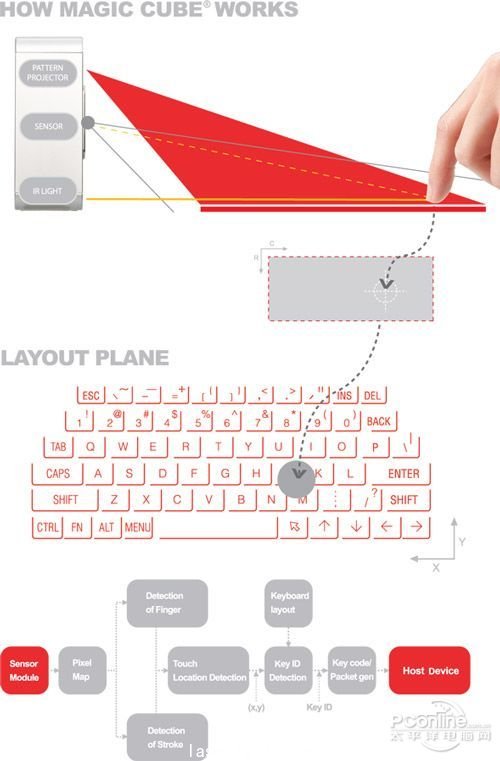 簡單而言,Magic Cube的工作原理就是利用頂部的激光投影出鍵盤的布局圖,當(dāng)手指觸碰到桌面時(shí),底部的紅外線傳感器就會(huì)感應(yīng)到信號(hào)的阻斷,并由中間的傳感器捕捉到具體的坐標(biāo)從而推算出用戶是在按哪一個(gè)按鍵。聽上去并不是特別復(fù)雜。