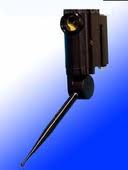 另外,API的TrackerIIPlus還支持一種智能測(cè)頭技術(shù),智能測(cè)頭是一種特殊的光學(xué)靶。底部裝有長(zhǎng)度可達(dá)幾百毫米的測(cè)桿,光靶設(shè)置在測(cè)頭的頂端。智能測(cè)頭內(nèi)部集成的傳感器,可以感知智能測(cè)頭相對(duì)于激光光線的姿態(tài)角變化。通過(guò)頂端光學(xué)靶的坐標(biāo)值和姿態(tài)角計(jì)算出底部測(cè)桿尖端的坐標(biāo)值,這樣就可以用測(cè)桿尖端去測(cè)量激光照射不到的工件背面以及較深的孔和槽。智能測(cè)頭的外形如圖3所示。