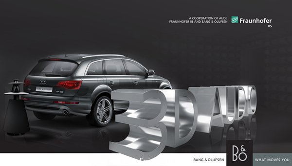 2013年1月16日,北京— 世界知名的音頻和多媒體技術(shù)研究機(jī)構(gòu)Fraunhofer IIS攜手全球獨(dú)家高質(zhì)音頻與視頻產(chǎn)品供應(yīng)商Bang & Olufsen及奧迪公司宣布,其在車載音頻3D音效技術(shù)領(lǐng)域取得突破。通過(guò)三方合作,3D音頻解決方案被引入奧迪Q7概念車,并在2013年消費(fèi)電子展(CES)奧迪展臺(tái)上亮相。
