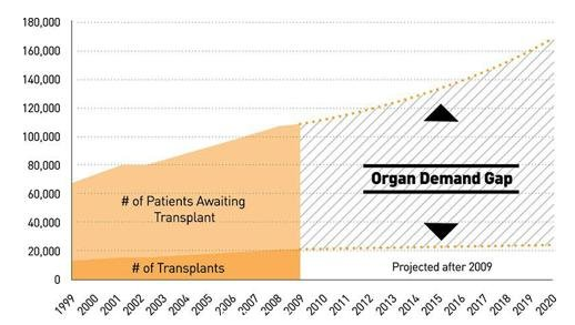 據(jù)致力于增加人體器官、眼睛和組織捐獻(xiàn)工作的美國(guó)非營(yíng)利性組織DonateLifeAmerica稱:“雖然醫(yī)學(xué)技術(shù)和捐獻(xiàn)一直在發(fā)展,但是市場(chǎng)對(duì)人體器官、眼睛和組織的需求仍然遠(yuǎn)遠(yuǎn)大于捐獻(xiàn)的數(shù)量。僅在美國(guó),就有超過11.5萬人正在等待器官移植。”