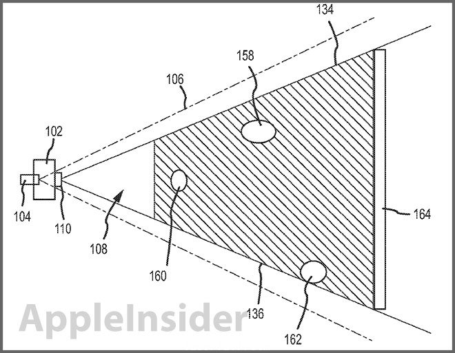 根據(jù)該專利描述顯示,例如當(dāng)激光源關(guān)閉時,圖像捕獲設(shè)備攝下第一張圖片,接著打開激光源,攝下第二章帶激光的圖片。此時處理器將分析這兩張圖片以抽離出激光部分。另外,圖像捕獲設(shè)備可能包含一個過濾器如波長過濾器或光學(xué)過濾器,可以濾除不同于激光波長的圖像,隔離出來的激光束則可用于測量目標(biāo)物體的形狀或深度。