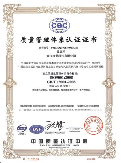 質量管理是企業(yè)發(fā)展的根本之道。此次證書的取得,標志著梅曼科技的激光產品和服務將踏上一個新臺階,同時也表明了該公司治理機制取得新突破,為該公司健康持續(xù)發(fā)展奠定了良好的基礎。