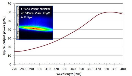 SuperK EXTEND-UV可以濾出270-400nm范圍的單波長(zhǎng),譜寬調(diào)諧范圍為3-14nm。下圖為EXTEND-UV配合6W超連續(xù)譜激光器SuperK EXR-15輸出的光譜圖。