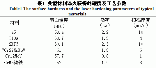 通過不斷的優(yōu)化實(shí)驗(yàn),得出了幾種有代表性的材料半導(dǎo)體激光淬火獲得的硬度及最佳的工藝參數(shù)如表1所示。