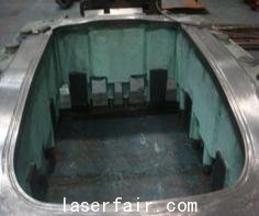 圖6汽車頂蓋拉延模,模具為Mo-Cr合金鑄鐵汽車頂蓋拉深模,激光處理前表面硬度為HRC40-45.由于拉深模工作表面硬度不夠,其工作表面易于工件產(chǎn)生粘著磨損,導(dǎo)致沖壓件被拉傷,生產(chǎn)過程中需要花費(fèi)大量時間對模具工作型面進(jìn)行推磨拋光,在線維修率達(dá)10%,經(jīng)激光表面強(qiáng)化后,模具表面硬度可提高到HRC58-62,處理后硬化層深度約為0.6-0.8mm,激光處理后模具使用壽命提高2-3倍,一次修磨拋光后的沖壓零件數(shù)已由原來300~500件提高到1000件以上,且激光淬火后的工件表面光亮,沒有任何氧化,后續(xù)機(jī)加工量非常小,大大節(jié)約加工時間和成本。