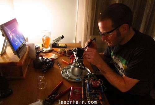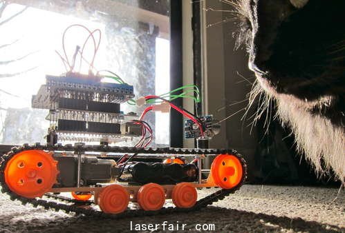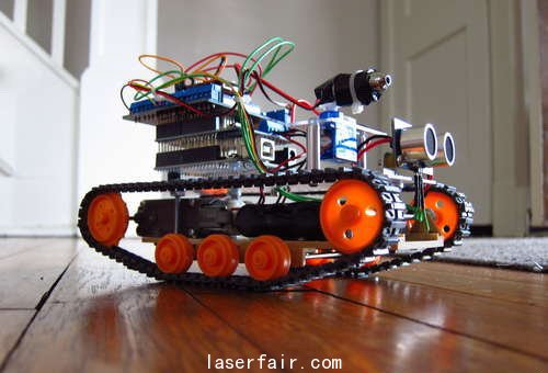 這個(gè)項(xiàng)目是透過(guò)網(wǎng)頁(yè)利用Arduino去控制能發(fā)射激光坦克,這借助Wifly來(lái)通信的,具體是通過(guò)網(wǎng)頁(yè)上的控制面板去操縱實(shí)現(xiàn)。坦克運(yùn)用ParallaxPing去躲避障礙物,這是一種瞄準(zhǔn)炮臺(tái)和坦克模型平臺(tái)定位的伺服系統(tǒng)。