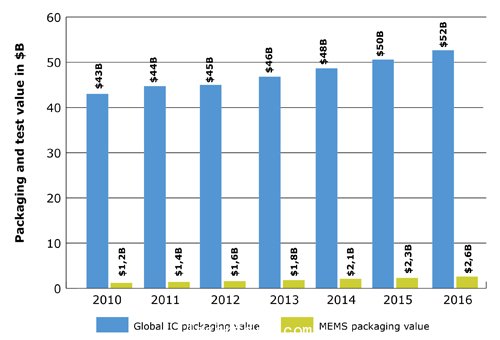 MEMS封裝產業(yè)的規(guī)模在2012年已達16億美元,總共出貨七十多億顆芯片,且市場需求正快速增加,20102016年整個MEMS封裝產值的年復合成長率(CAGR)將達到20%,至2016年出貨量將上看一百四十億顆。不過,低成本消費性電子產品逐漸主導MEMS市場,也為相關廠商帶來價格壓力,將使營收的CAGR僅有10%,至2016年將達到26億美元(1)。