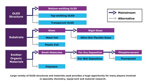 由于OLED未來(lái)展望是這樣的狀況,包括設(shè)備制造商、熒光及磷光發(fā)光材料供貨商、聚合物材料開(kāi)發(fā)商,以及軟性基板的玻璃、塑料或金屬箔片制造商均已大舉投入發(fā)展,甚至有幾家企業(yè)正積極開(kāi)發(fā)新的OLED結(jié)構(gòu)、封裝、滲入阻隔及新款電極的塑料或特殊技術(shù)方案。有如此眾多的企業(yè)涉及OLED照明領(lǐng)域可能頗令人意外,但這與有多少?gòu)S商涉入整個(gè)價(jià)值鏈有關(guān),而不只是有多少?gòu)S商在制造OLED面板。