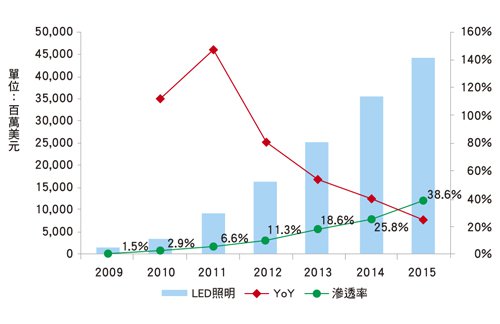 現(xiàn)階段在政府政策加持以及廠商致力提升質(zhì)量與降低成本下,LED照明已逐漸為消費(fèi)者所接受,特別是工商用市場因?yàn)殚_燈時(shí)間較長,大幅拉低其轉(zhuǎn)換LED燈具所需的回本時(shí)間,因此LED照明市場可望開始出現(xiàn)顯著成長。根據(jù)Digitimes統(tǒng)計(jì),2012年全球LED照明市場規(guī)模約165億2,000萬美元,年成長率(YoY)80%,預(yù)計(jì)至2015年,整體市場規(guī)??蛇_(dá)442億美元(圖2)。#p#分頁標(biāo)題#e#