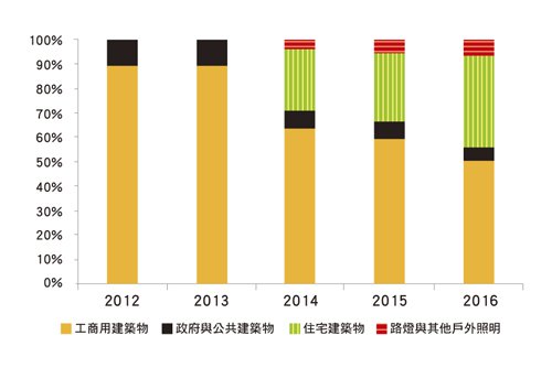 與LED照明發(fā)展初期相同,智能照明系統(tǒng)因?yàn)槌跗诮ㄖ贸杀据^昂貴,因此建置所能帶來成本下滑幅度多寡,變成消費(fèi)者是否采納的關(guān)鍵。由于辦公大樓、百貨公司、復(fù)合式商場以及量販店等,照明設(shè)備占耗電比重均達(dá)25~30%,因此工商用市場成為智能照明系統(tǒng)主要需求者。就2012年來看,工商用市場占比即接近90%,其次則是政策導(dǎo)向的政府與公共建筑,占比約在10%左右,預(yù)計(jì)住宅部分要等到2014年,相關(guān)產(chǎn)品價(jià)格大幅滑落后,占比才會(huì)有顯著增長(圖3)。
