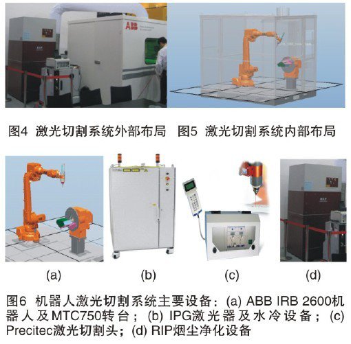 機(jī)器人激光切割系統(tǒng)外部布局和內(nèi)部布局分別如圖4和圖5所示。整個(gè)系統(tǒng)主要由ABB IRB 2600機(jī)器人及MTC750轉(zhuǎn)臺(tái)(圖6a)、IPG激光器及水冷設(shè)備(圖6b)、Precitec激光切割頭(圖6c)、RIP煙塵凈化設(shè)備組成(圖6d)。