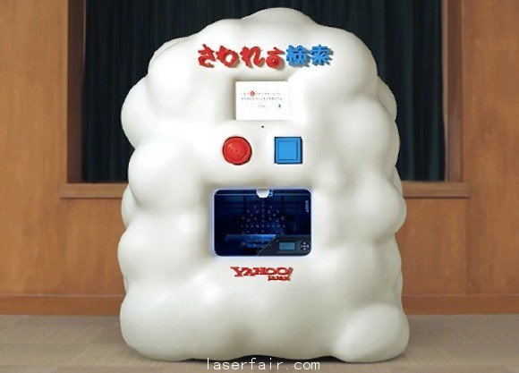 這部特別的打印機(jī)來自東京一個(gè)叫做Hands on Search的研究項(xiàng)目,由Yahoo Japan全額贊助。項(xiàng)目宗旨打的是讓搜索具象化。打印機(jī)的外觀大致就是這樣。兩個(gè)紅藍(lán)按鈕,物品在這個(gè)大箱子內(nèi)打印。特色在于語音搜索功能。