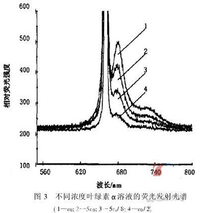 式(1)中:k為儀器常數(shù);Q為物質(zhì)熒光效率;I0為激勵光光強;c為物質(zhì)濃度;b為樣品光程差;ε為摩爾吸收系數(shù)。當(dāng)所測量的熒光物質(zhì)確定后,k,Q,I0,b,ε均為常數(shù),則c與F成一定數(shù)學(xué)關(guān)系。對上式進(jìn)行分析可知,當(dāng)溶液很稀時,εcb很小,則上式指數(shù)部分近似為1-εcb,相應(yīng)的F=kQI0εbc=ωc(其中ω=kQI0εb,在激勵光光強穩(wěn)定時是常數(shù)),即此時葉綠素α濃度與相對熒光光強近似成線性關(guān)系。因此在同一穩(wěn)定的激發(fā)光激勵下,可以根據(jù)葉綠素α的熒光發(fā)射光譜方便直觀地判斷葉綠素α的濃度。