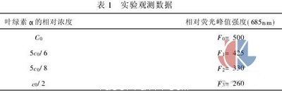 實驗具體過程如下:用圖1所示實驗裝置先測得不放葉綠素樣品時乙醇溶液在激光照射下的透射光譜,如圖2所示;采集新鮮樹葉若干,剪碎研磨后用高純度的無水乙醇5ml配成標(biāo)準(zhǔn)溶液,濃度記為c0,用相同實驗裝置測得該濃度下葉綠素α的熒光發(fā)射光譜,相對熒光峰值強度記為F0;然后逐步添加無水乙醇稀釋成6ml、8ml和10ml的三種不同濃度的溶液,稀釋后的溶液濃度依次記為5c0/6、5c0/8和c0/2,用相同的方法分別測得不同濃度下對應(yīng)的熒光發(fā)射光譜,相應(yīng)的熒光峰值強度記為F1、F2和F3,測得熒光發(fā)射光譜和實驗中獲得的數(shù)據(jù)分別如圖3,表1所示: